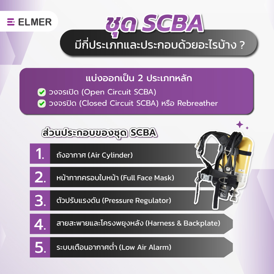 ข้อควรรู้ก่อนเลือกซื้อชุด SCBA อย่างแรกคือ ประเภท และ ส่วนประกอบ สำหรับชุดช่วยหายใจ SCBA สามารถแบ่งออกเป็น 2 ประเภทหลักตามวิธีการทำงานหรือการจ่ายอากาศ และชุดอุปกรณ์แต่ละประเภทจะประกอบด้วยส่วนประกอบสำคัญหลายอย่าง ดังนี้